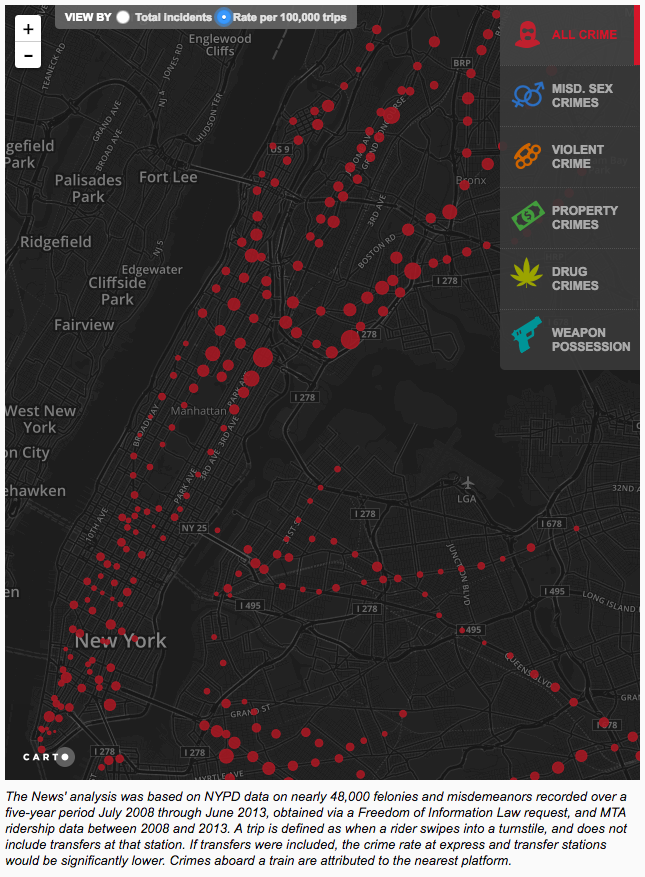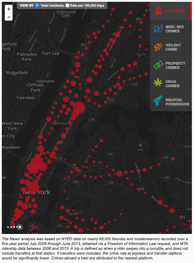 こちらの例を見てみましょう。ニューヨーク地下鉄の駅の犯罪マップには、重罪犯の数、対象となる期間、詳細の測定方法、などが注意深く注釈されています。見たところ、最も犯罪数が多いことを示す赤丸の大きな地域である、タイムズスクエア、14番街 - ユニオンスクエア、125番街は避けた方がよさそうです。