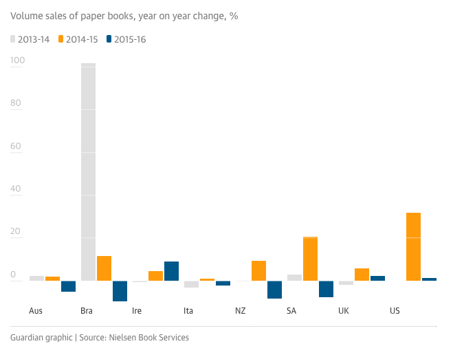 付加コンテキストを使用したその他の例として、こちらの整然として分かりやすいガーディアン紙からのグラフを見てみましょう。これは、世界中の書籍販売売上の上昇と下降を示しています。グラフから、ブラジルの売上は2013年 - 2014年に2倍近くになっていますが、2015年 - 2016年に最大の落ち込みを見せていることが分かります。これはなぜでしょう。ただ、このグラフを見るだけでは分かりません。そして、イギリスとアメリカが、過去3年間で毎年書籍販売の売上を伸ばし続けている理由も分かりません。