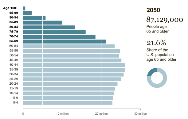 以下は、ニューヨークタイムズ紙からの例で、観測タイプのコンテキストは、既にあるデータにさらなる情報を追加しないことを示しています。値を自分で計算することもできますが、データ提供者が注目してほしい点を明確にし、強調しています。右側のテキストは、2050年に推計される65歳以上の国民の数、という特定の数字を強調しています。また、コンテキストを明らかにするために、この数字を予測されるアメリカの人口の割合として示しています。これは、グラフを閲覧すれば分かるため新しい情報ではありませんが、役に立つ正確なコンテキストです。