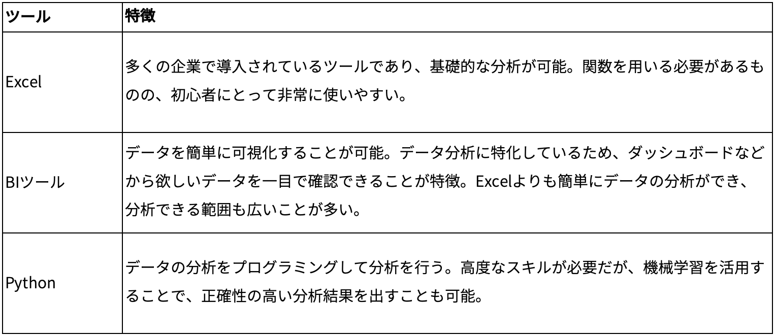 データ分析はExcelなどの表計算ソフトでも行えますが、知見を持った人材の採用やデータ分析を素早く行える分析ツールの使用がおすすめです。また、高度な技術が求められますがPythonを用いれば、分析を基に機械学習を行わせられます。