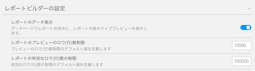 新しいシステム構成設定が追加され、レポートビルダーで構築されるデータをプレビューするためのロウ(行)数と、有効なレポートに返される結果のロウ(行)数のデフォルト制限を定義できます。これらの設定は、すべてのレポートにデフォルト制限を適用しますが、これは個別のレポートレベルで変更可能です。