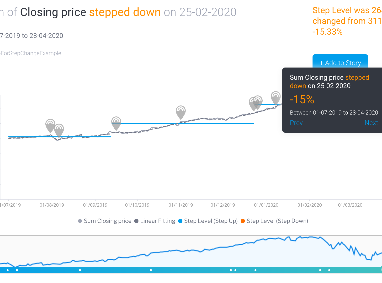 ステップの変化は、データの時系列がひとつの安定したパターンから、前のパターンの上または下、そして閾値を超える別の安定したパターンに移動するときに生じます。急増や急減はデータの急激な変化を強調しますが、ステップの変化は、安定期間のより重要で永続的な変化を強調します。