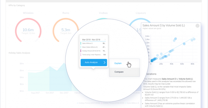 BI専用ソリューションは、ダッシュボードのデザインを大幅に進化させ、専門家に分析を委ねるのではなく、より多くのユーザーがダッシュボードを使用できるようにすることで、セルフサービス分析を奨励します。これにより、グラフや指標を無作為に、または説明なしに表示することはなくなりました。今日のBIベンダーは、強力な自動化やビジュアライゼーションを提供することで、画面上の情報をより多くの人々に伝えることができます。