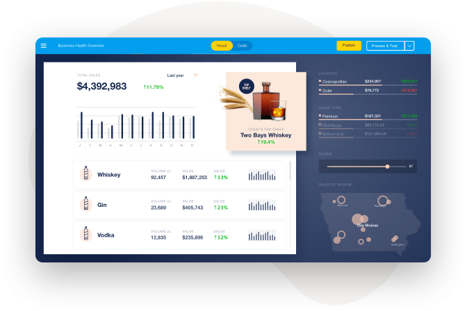 ビジネスの経営者は、BIダッシュボードを使用することで、様々なソースからのデータを一つの画面上で素早く簡単に閲覧、探索、掘り下げることができます。