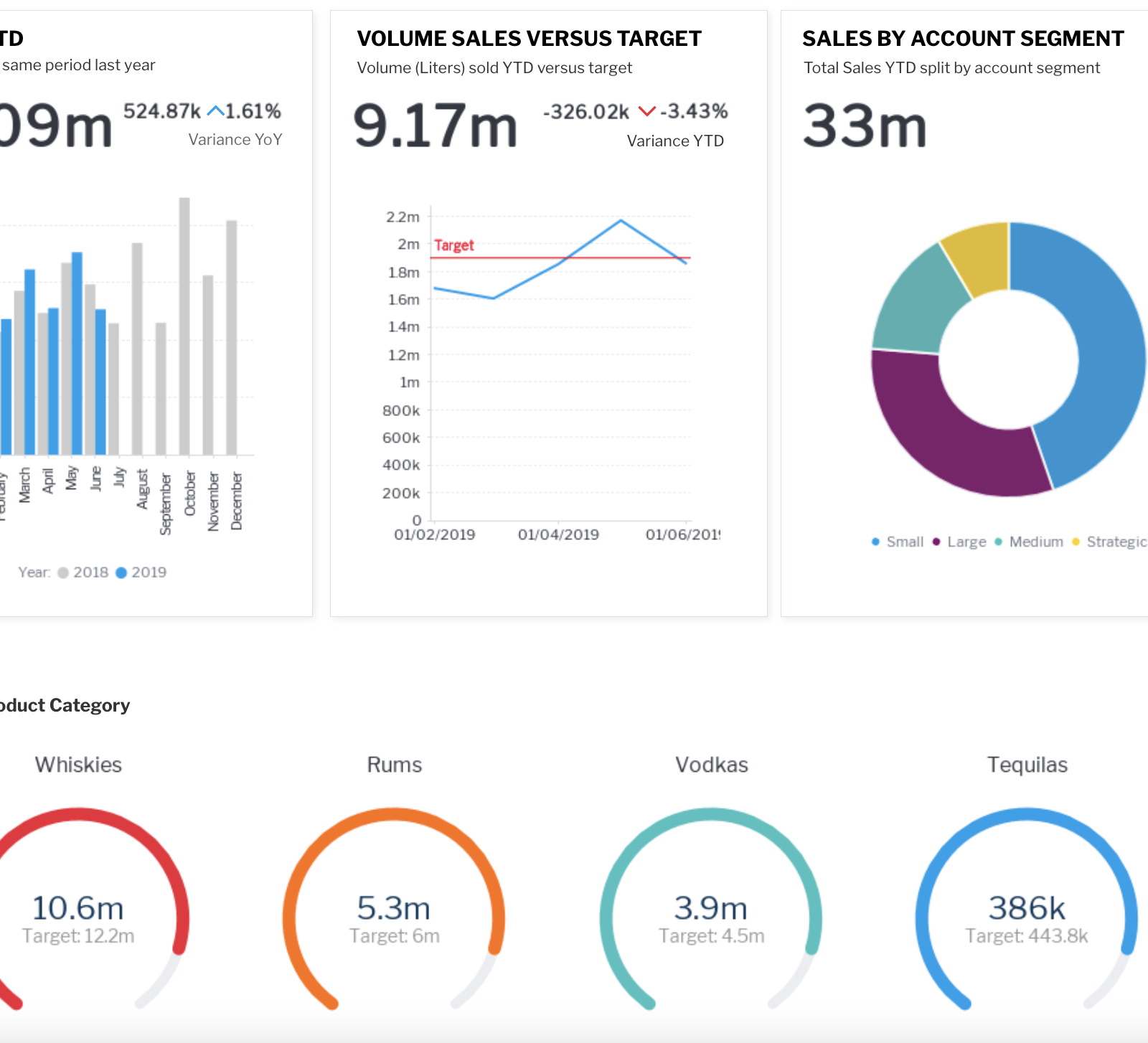 例えば、Yellowfinのインタラクティブなダッシュボードギャラリーで確認することができるKPIダッシュボードのベストプラクティスの例では、KPI、製品、店舗の場所にわたる酒類販売の前年比の売上概要が示されています。こちらのダッシュボードでは、以下を実現することができます。