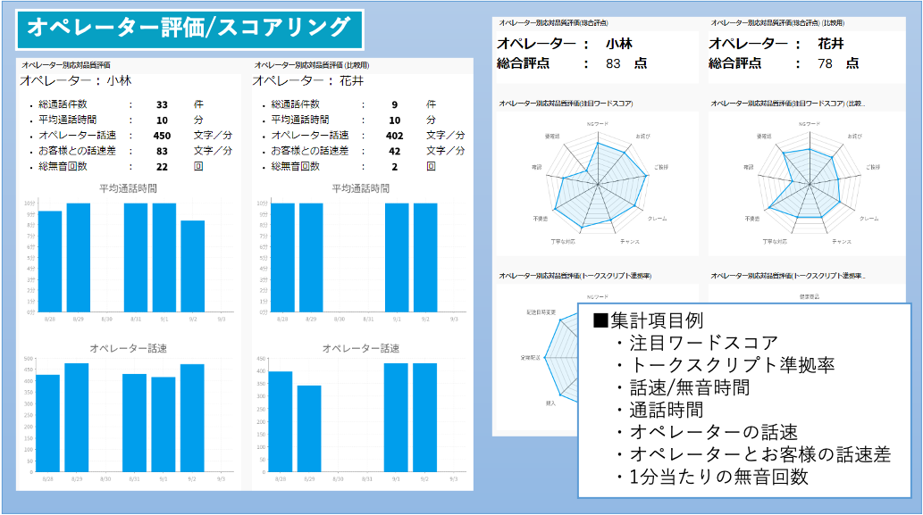 刷新されたダッシュボードでは、応対件数や平均応対時間、コールリーズン数(顧客がコールセンターに電話をかける理由の数)、注目ワード数などが表示できるため、コールセンターの運営状況とオペレーターの応対品質がいつでも確認できるようになっています。さらに状況を深掘りできるよう、「オペレーターがコールセンターで決められたルールやトークスクリプトに準拠しているか、分析してスコア化してグラフで表示することもできます。またオペレーターごとにどこができていて、どこができていないのかなど、応対内容を評価することもできます。オペレーターの適切な指導、育成にも貢献できると思います」と木村氏は説明します。
