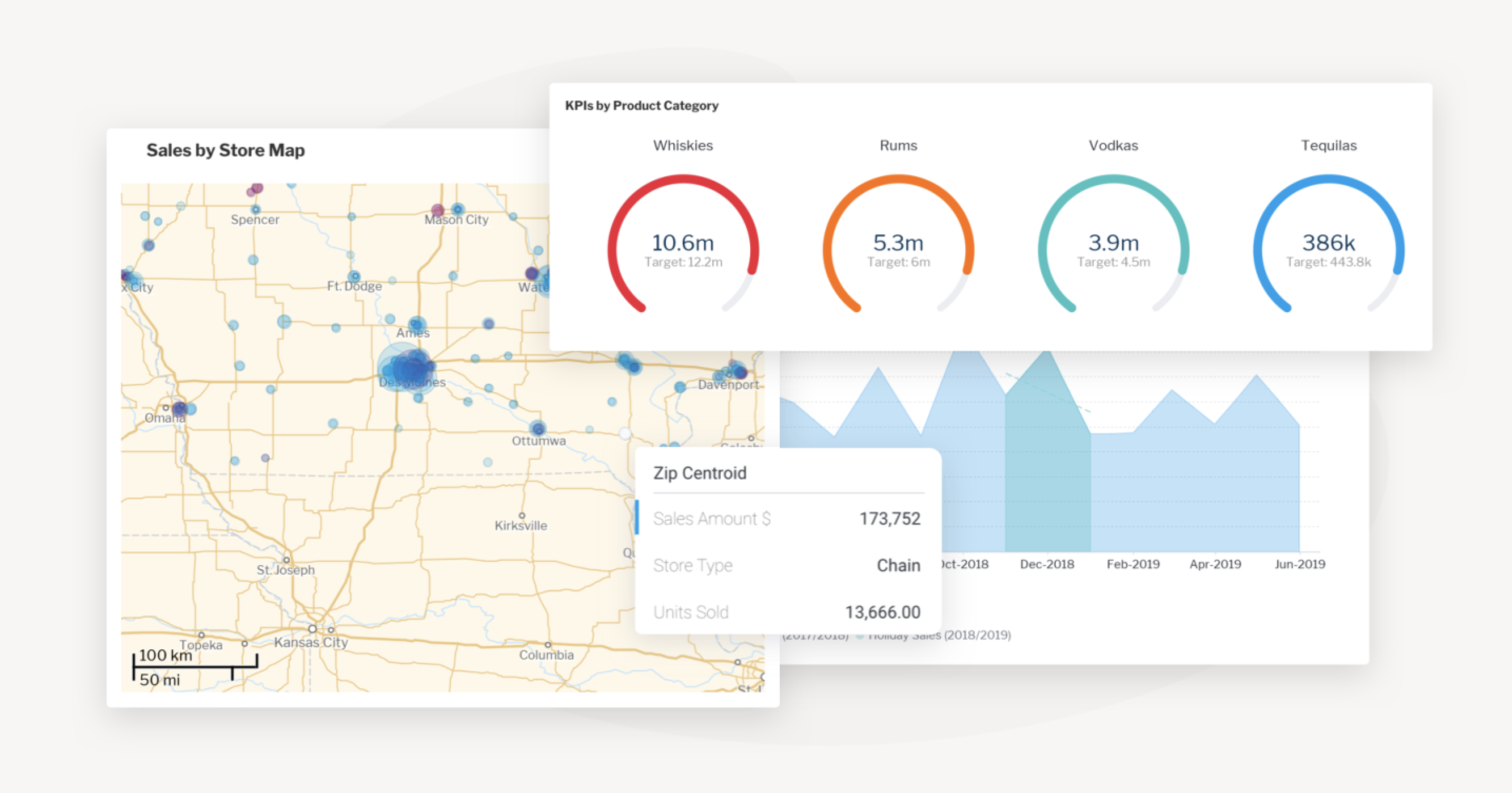 BIダッシュボードは、情報を理解しやすい形式でデータを可視化し、ビジネスの様々な面で素早く比較するのに役立ちます。グラフやマップのようなデータビジュアライゼーションは、(表や数字など) ロウデータの閲覧からでは困難な傾向やパターンの特定をサポートします。