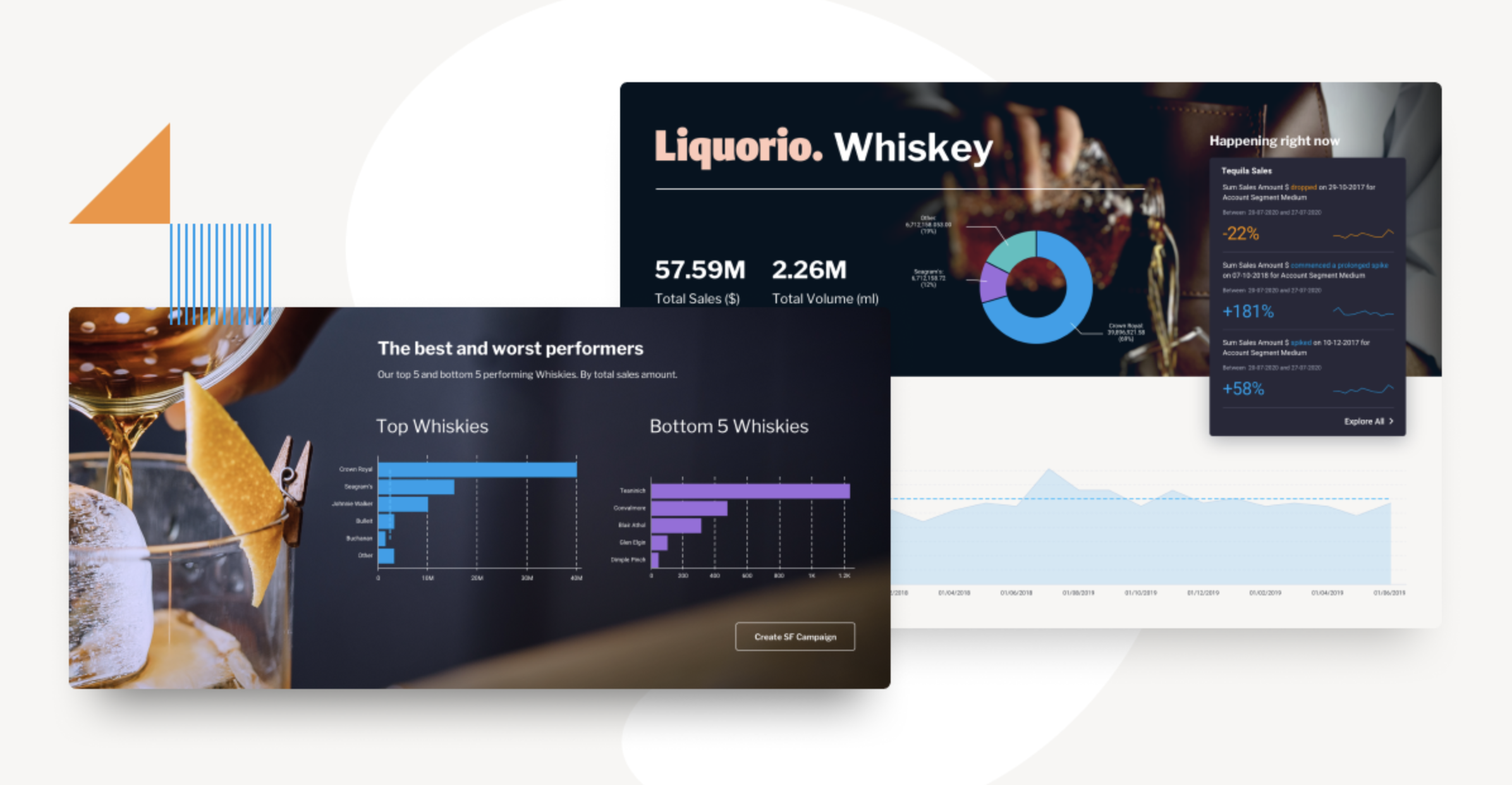 アクションベースのダッシュボードにより、データに対する変化を素早く簡単に把握することができます。フリーフォームでノーコード・ローコード、およびドラッグアンドドロップのダッシュボードを使用することで、強力なレポートやビジュアライゼーションを素早く簡単に作成することができます。