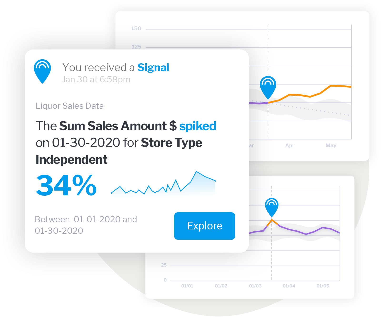 その理由のひとつは、自動ビジネスモニタリングが、データアナリストの現状に挑戦しているからです。基本的に、シグナルのような製品は、膨大な量のデータを自動的に掘り下げ、変化や傾向、急増や急減などを探します。これにより組織は、対応すべきビジネスの変化を即座に特定することができます。