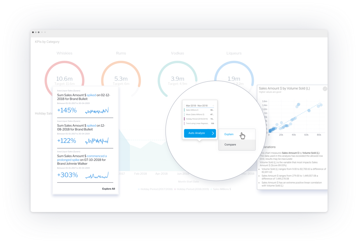 自動分析という形式で従来のダッシュボードに機械学習を導入したことで、自身で分析が行えるダッシュボードが作成可能になりました。わたしのようなビジネスユーザーは、当たり前を超えた変化を取り上げることはありませんが、従来のダッシュボードに自動インサイトの検出機能が搭載されていれば、その必要はありません。何かを発見したとしても、自動インサイトが自然言語を用いて変化に影響を与えた可能性のある要因を説明してくれます。これは、監視からディスカバリー(検出)まで、ダッシュボードエクスペリエンスを即座に変更させ、ユーザーに定期的に確認すべき理由をもたらします。何かを見付けようとしてむやみに探し回るのではなく、自動化が見るべき場所を教えてくれます。