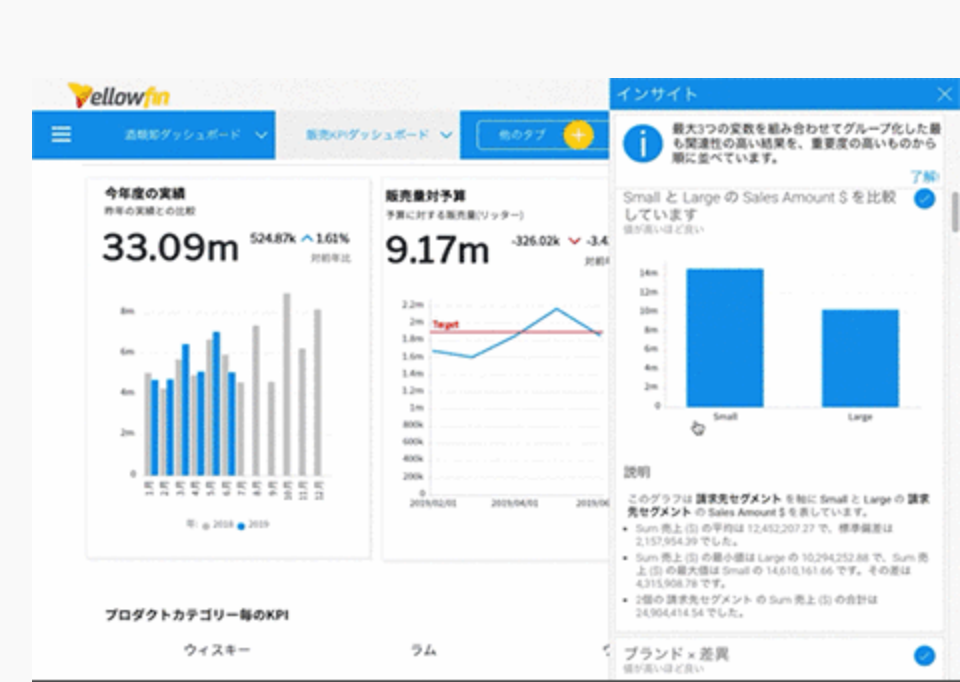 多くのBIツールは、売上や在庫数などビジネスに重要な数字に変化があると、それを知らせてくれるだけですが、Yellowfinは重要なデータの変化はもちろん、「なぜそれが起きたのか」というその原因までを自動で分析し、ユーザーに提示することができます。