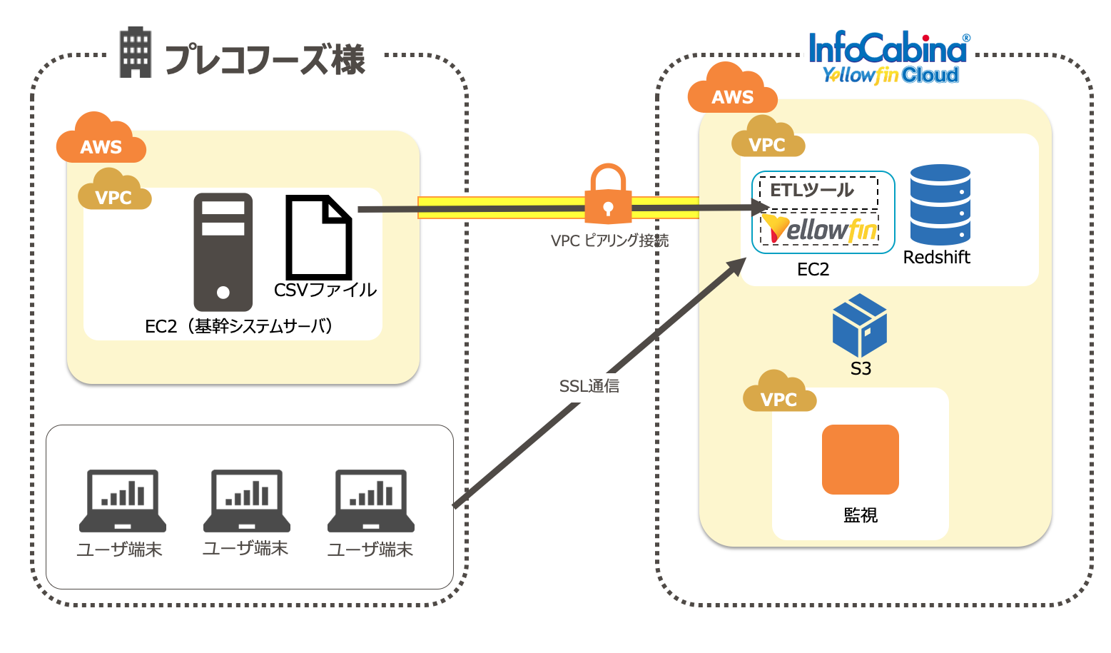InfoCabina Yellowfin CloudはBIツールのYellowfinをクラウドで提供するだけのサービスではありません。データ連携のためのETLツールとデータを格納するデータベース(Amazon Redshift / RDS)をパッケージ化し、オールインワンで提供。「このソリューションを活用すれば初期のレポート作成費用だけですぐに始められ、スケールアップも容易です。私たちが挙げた条件を満たしていたことから、InfoCabina Yellowfin Cloudを導入することに決めました。」(田中氏)