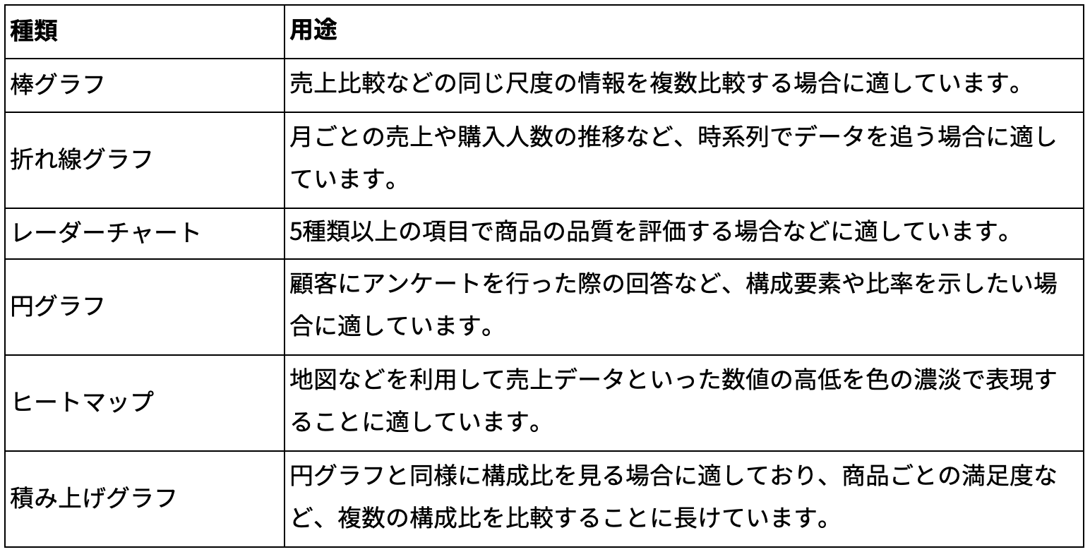 グラフやチャートを目的に応じて使い分けることでデータ可視化の効果はより高まります。具体的なグラフやチャートの使用用途は覚えておくとよいでしょう。