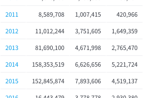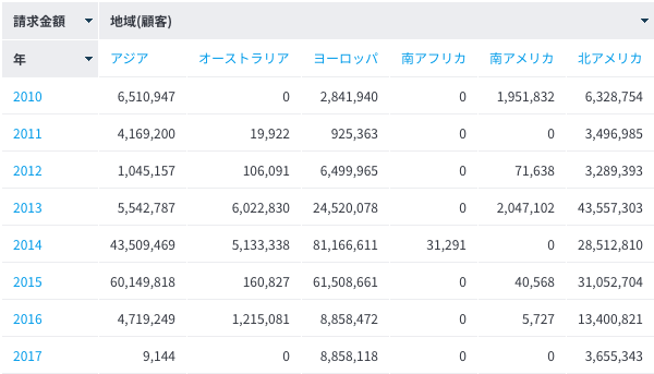 以下の表は、プログラムが実行された年と、顧客の国の両方からドリルダウンが可能です。