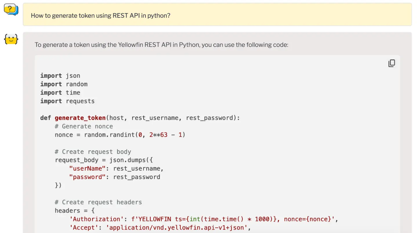 Ask Yellowfinは、開発者がYellowfin プラットフォームをナビゲートし、基本的なナビゲーションから複雑なデータ分析タスクまで、最適な使用方法に関する質問をするための専門的なガイダンスに迅速にアクセスできる方法を提供します。これにより、全体的なエクスペリエンスをよりシームレスなものにします。Code Assistantは、Yellowfin REST APIやJSAPIに関するクエリーに対して技術的なサポートを提供し、コードサンプルの生成に使用できます。