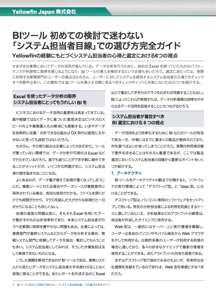 この資料では BI ツールを導入する際に見るべきチェックポイントと失敗しないためのコツを紹介します。