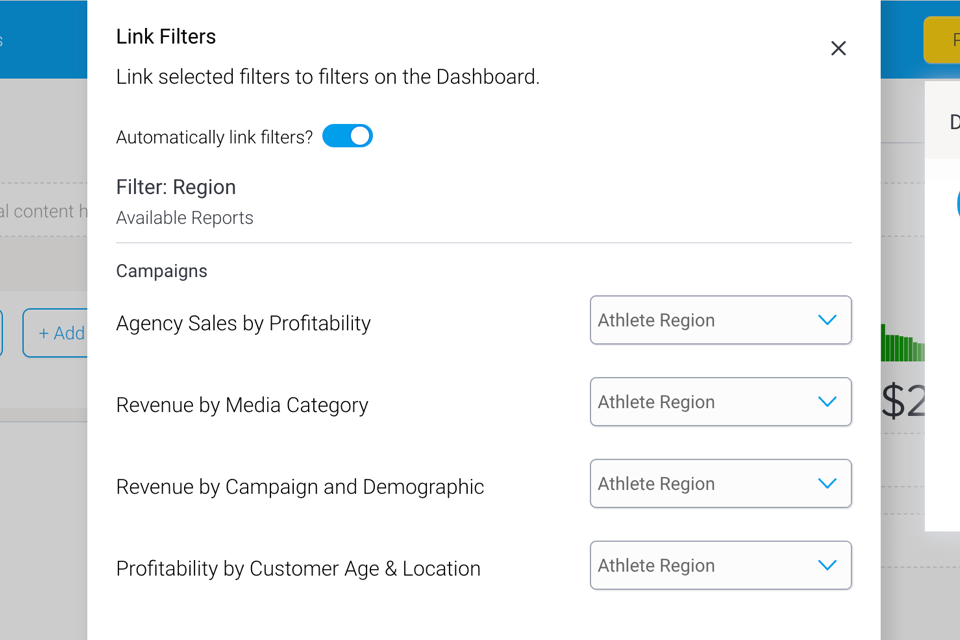 同じデータモデルを使用しているレポートが、ダッシュボード上に複数ある場合に、フィルターを自動的にリンクできるようになりました。キャンバスにレポートをドラッグするだけで、Yellowfinがあなたにかわって作業を行います。