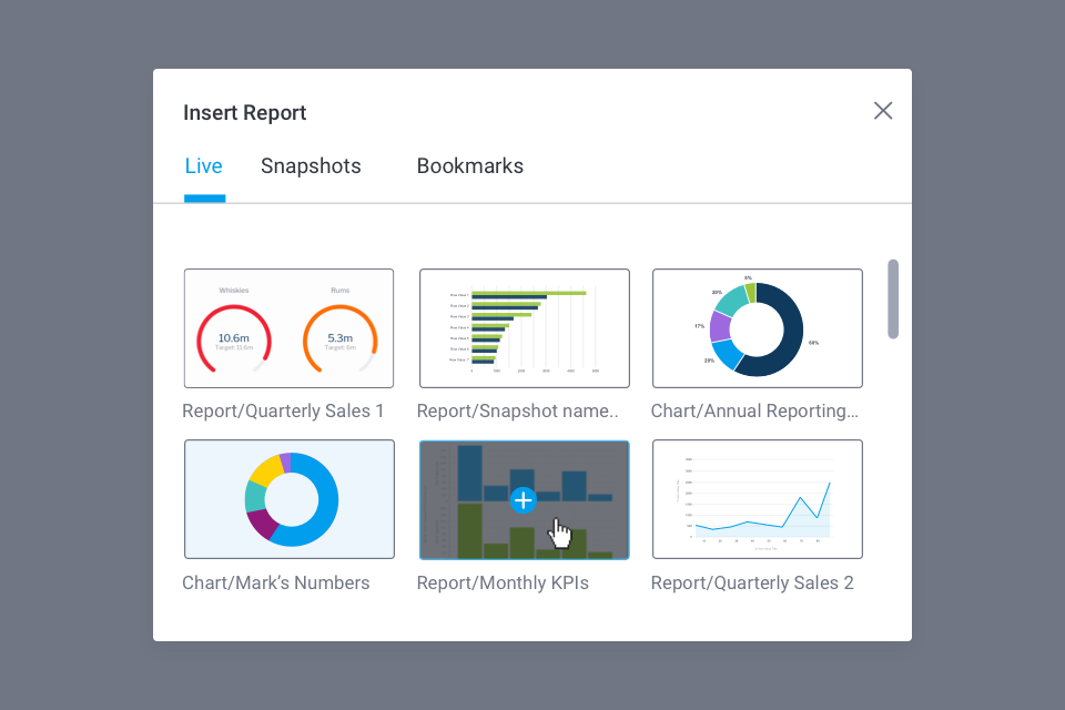 新しいユーザーインターフェースでは、レポート内の様々なタイプのコンテンツを検知し、特定のグラフ、スナップショット、ブックマークを選択することができます。