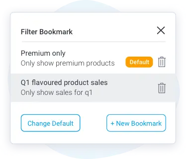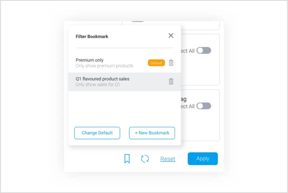 最初に読み込まれたとき、またはフィルターがリセットされたときに自動的にダッシュボードに適用される、パーソナライズされたデフォルトフィルターのブックマークを保存できるようになりました。