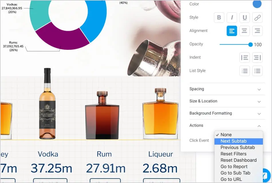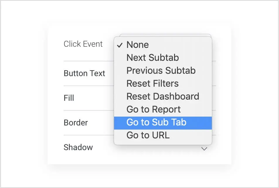 アクションボタンとその他すべてのダッシュボードウィジェットに新しいイベントが導入されました。これらには以下が含まれます。外部ページに移動する「URLに移動」、ダッシュボードやプレゼンテーション内のサブタブやスライドに移動する「サブタブに移動」があります。