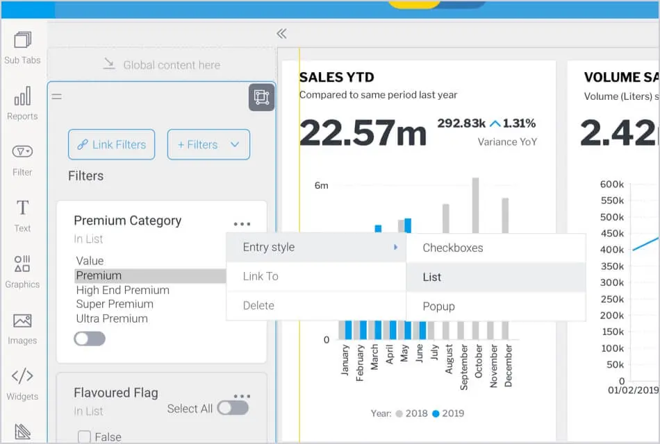 ダッシュボード内のフィルターの表示スタイルを変更できるようになりました。これにより、入力スタイルをチェックボックス、リスト、ポップアップ、ドロップダウン、ラジオボタンに変更することができます。