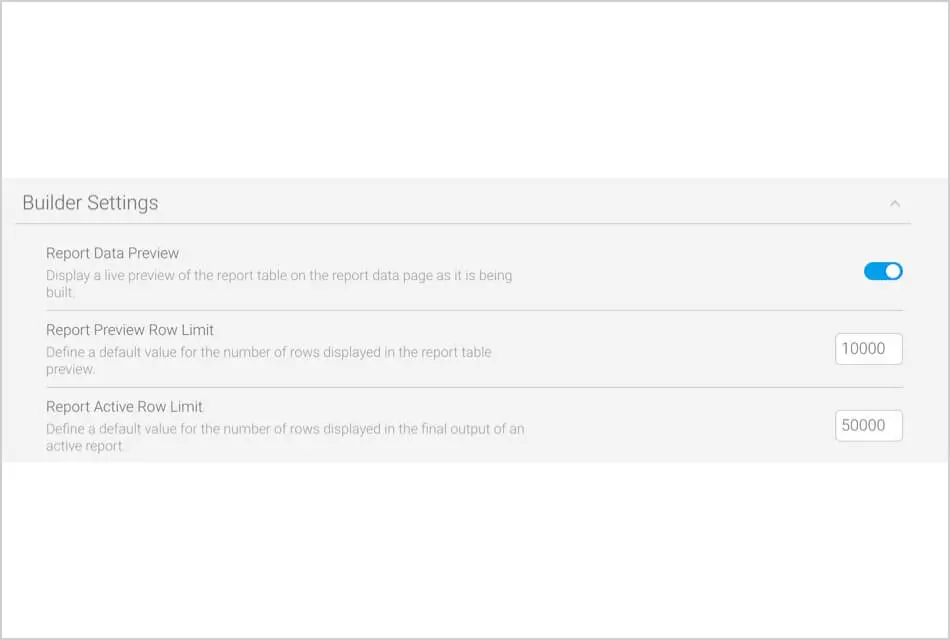 新しい構成オプションでは、レポートビルダー内で作成中のデータをプレビューする行数と、アクティブなレポートで返される結果の行数のグローバルなデフォルトの制限を定義できるようになりました。この機能強化の一環として、これらの設定はすべてのレポートに適用されますが、個々のレポート レベルで変更することもできます。