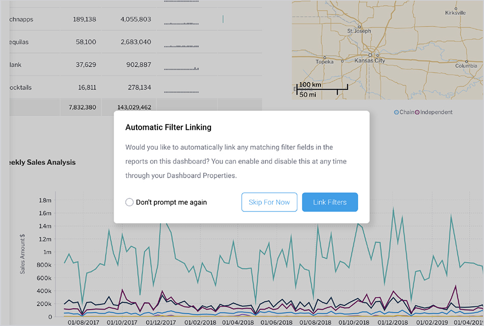 ダッシュボードの自動フィルターリンクに「今はしない」オプションが追加され、アナリティクスコンテンツ間でフィルターをリンクする場合に、実際に自動化を活用するタイミングを詳細に制御できるようになりました。