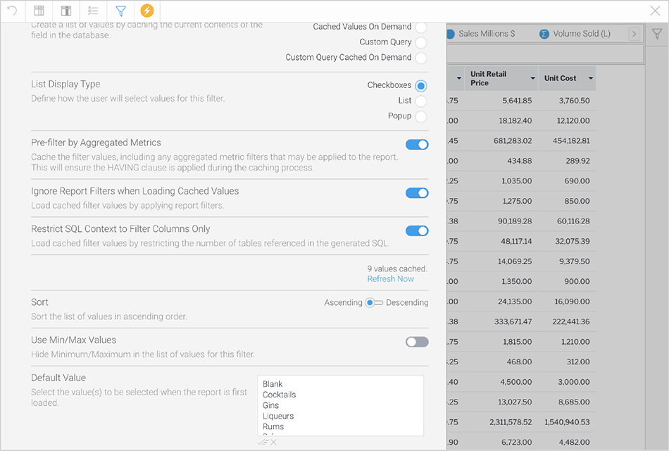 キャッシュされたフィルターの新しいフィルターオプションにより、ワンクリックでSQLコンテキストを制限できます。これにより、キャッシュされたフィルター値を単一のディメンションテーブルから取得するか、レポートクエリーから他のテーブルへの結合を含めるかどうかを決定できます。改善点として、フィルター値をキャッシュするときに、既存のレポートフィルターを適用するかどうかを選択できます。