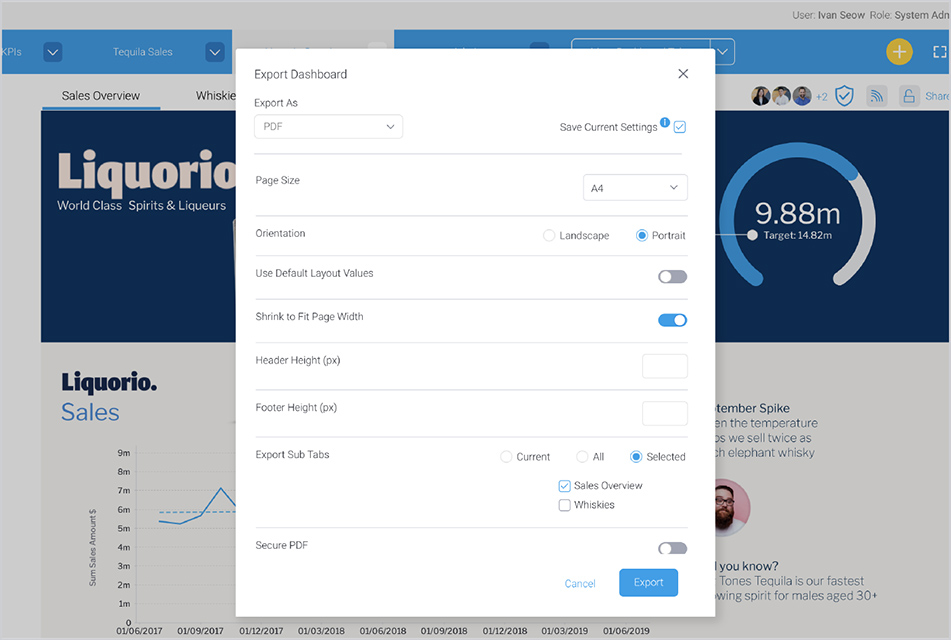 PDFへの保存時に特定のダッシュボードのサブタブや、プレゼンテーションスライドを選択できるようになったことで、迅速なエクスポートや小容量PDFファイルを実現します。