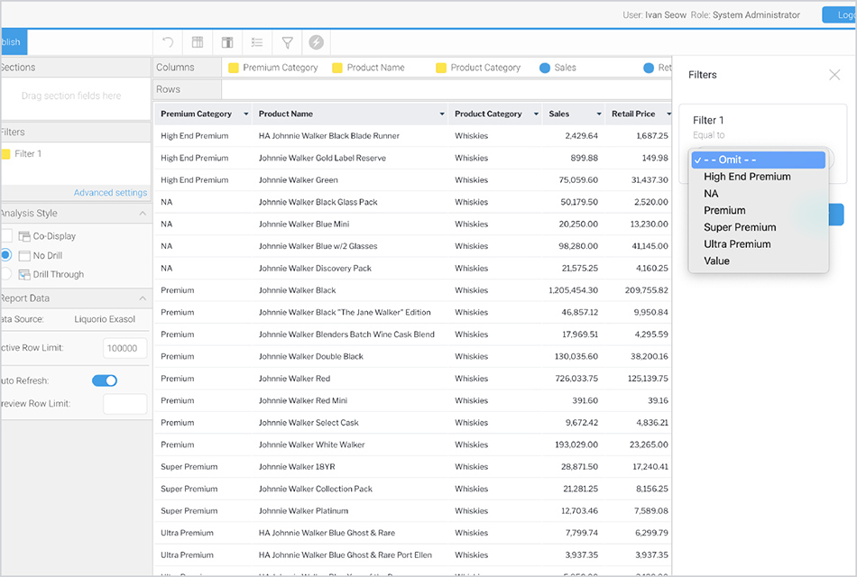 フリーハンドSQLレポートのフィルターパラメーターをオプションとして設定できるようになり、フィルター値が指定されていないフリーハンドSQLレポートを実行できるようになりました。改善点として、NULL値を処理する高度なSQLロジックをサポートします。
