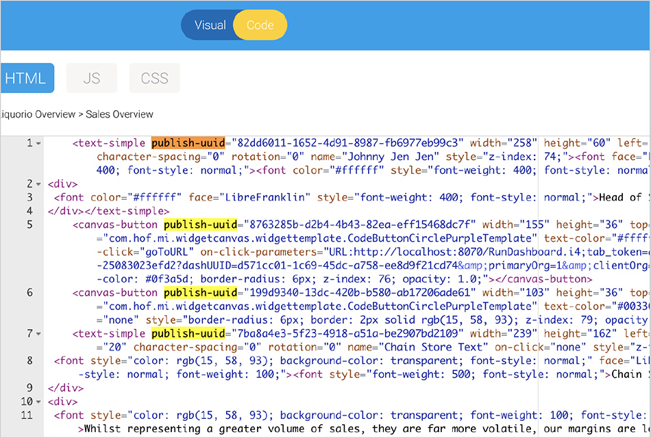 公開UUID属性がコードモード、JavaScript API、コードウィジェットに追加され、ダッシュボードの編集やすべてのバージョンにわたり、永続的な方法でキャンバスオブジェクトを参照できるようになりました。