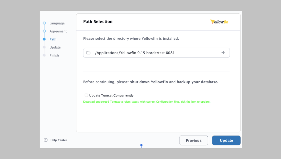 手動でのセキュリティパッチ作業は過去のものになりました。Yellowfin 9.16 のプラットフォームアップデーターには、Apache Tomcat のコアコンポーネントを自動的にアップグレードするオプションが追加されました。これにより、手間のかかる手動作業が不要となり、重要なセキュリティパッチを常に適用した最新の状態で運用を維持できます。