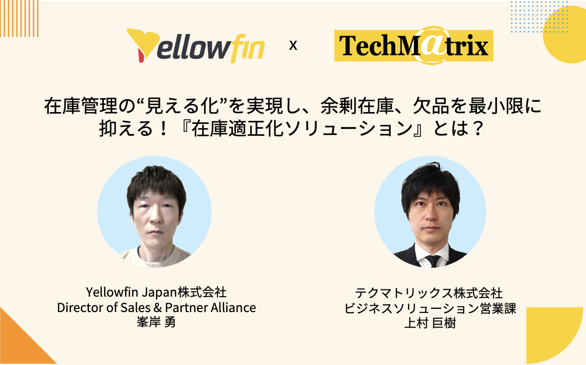これらの課題を解決するためには、在庫情報を“見える化”し、適正な在庫量を予測・分析、リアルタイムで情報共有できるプラットフォームが必要不可欠です。本セミナーではYellowfinを活用し、ユーザー企業様の業務ノウハウを融合して生まれたテクマトリックス社の「在庫適正化ソリューション」を紹介します。