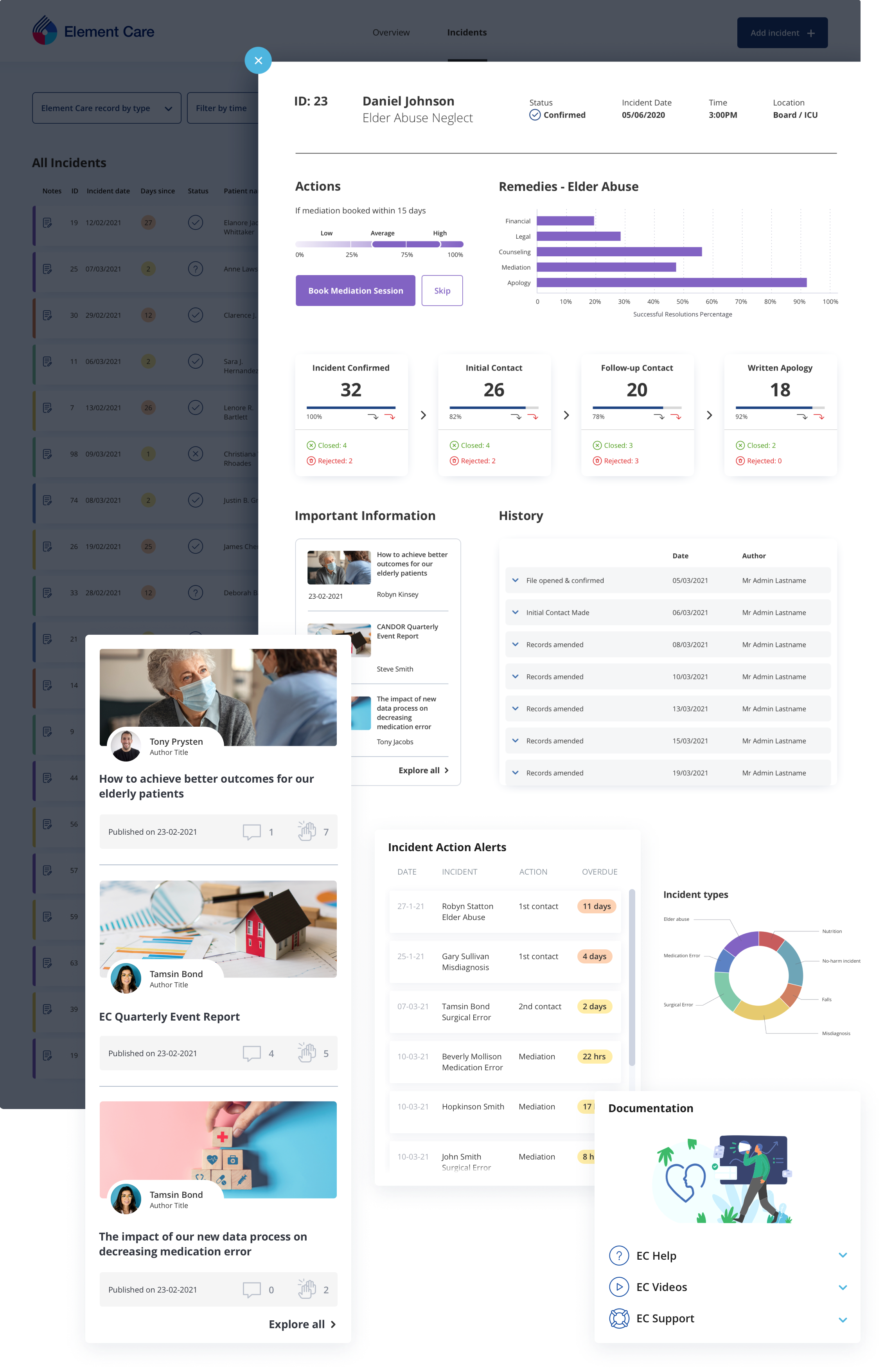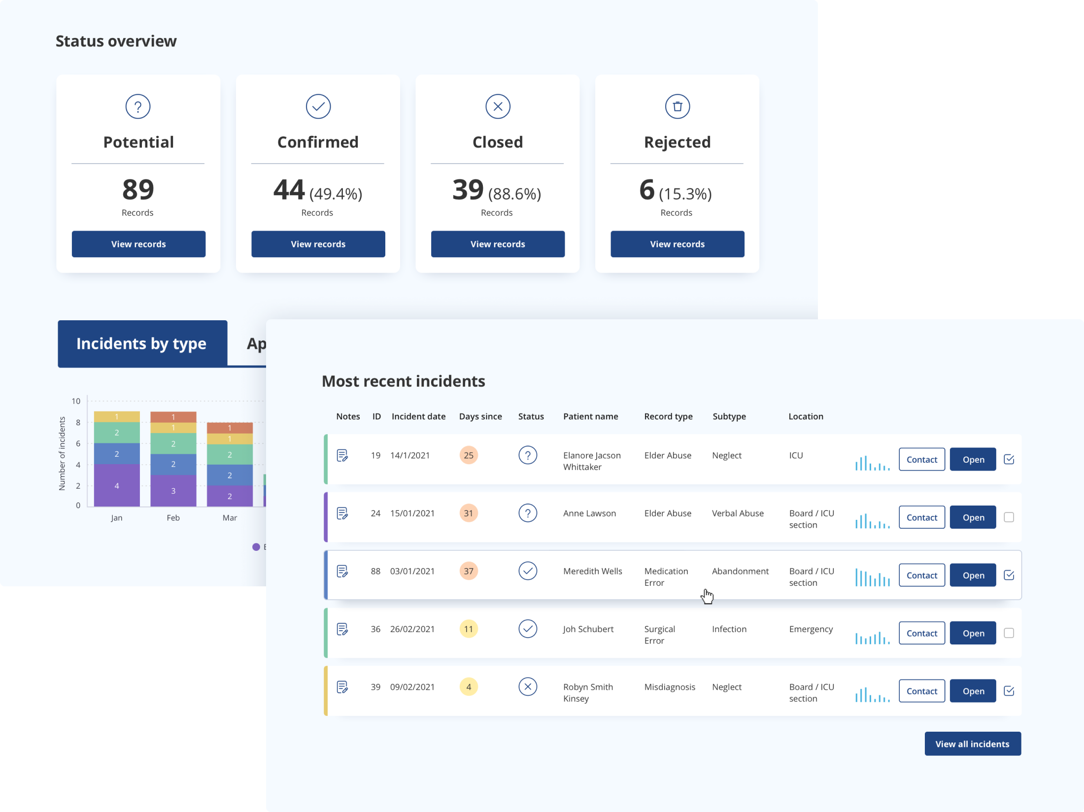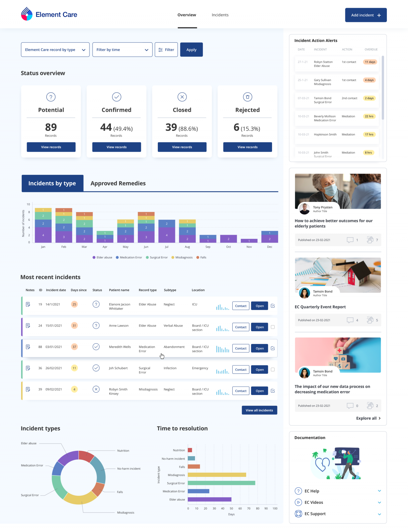 Element Careのダッシュボードは、既存のアプリケーションにアナリティクスを組み込んだりホワイトラベル化して、アプリケーションの作業内で、ユーザーにコンテクストデータを提供する例です。このケースでは、病院内のインシデントの記録と管理に役立てています。