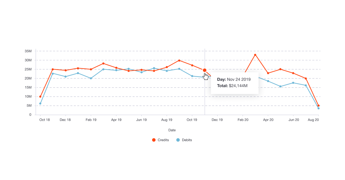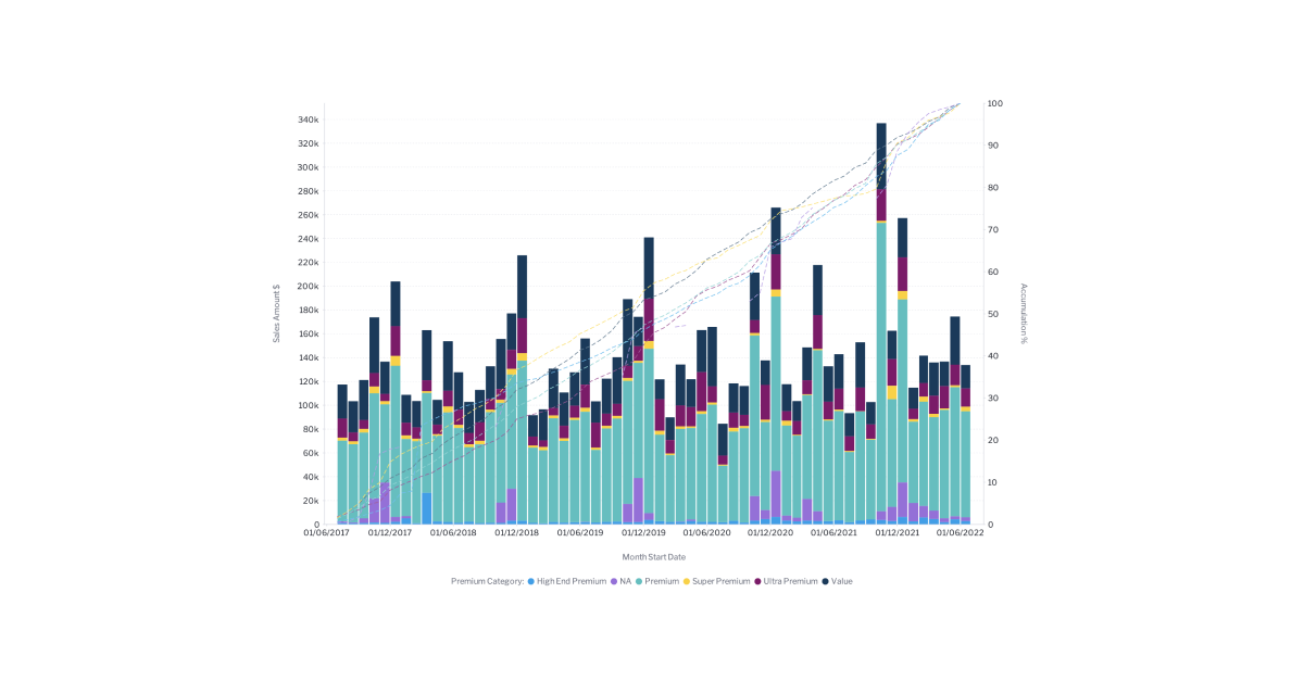 全体の傾向やさまざまな種類のグラフは、ビジネスリーダーが将来の結果を予測するのに役立ちます。線が上に動けば、一般的にポジティブな変化を示し、下に動けばネガティブな変化を示します。複数のカテゴリのトレンドを同じ期間で明示的に比較したいときに特に便利です。