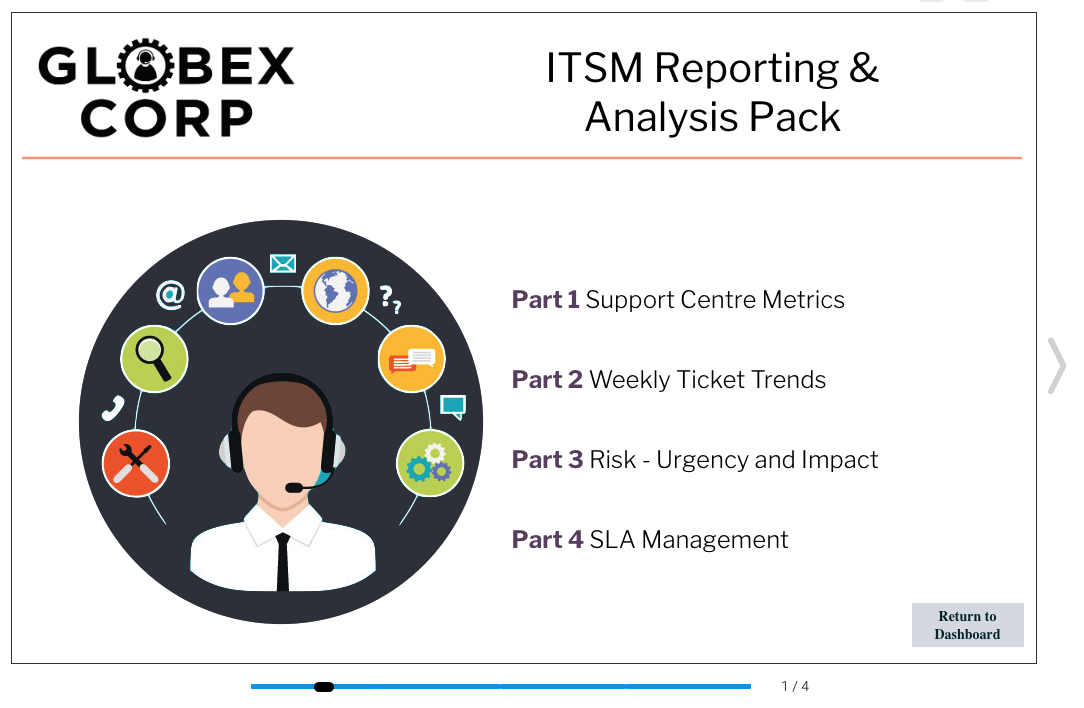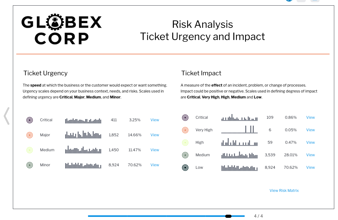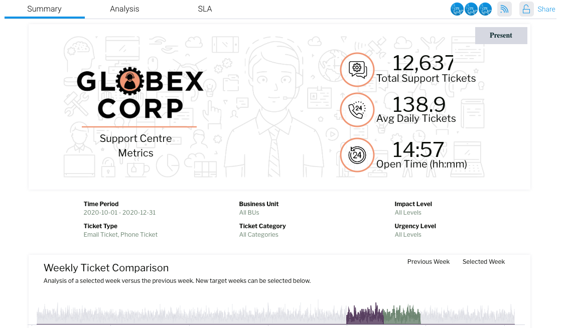 プレゼントで作成されたプレゼンテーションの閲覧者は、表示されるデータが正確であることを把握しています。これは、従来のKeynoteやPowerPointに見られるようなデータの静的なイメージではなく、使用する時点のビジネスパフォーマンスを動的かつリアルタイムに更新するためであり、ITSMレポーティングを向上させるために最適なソリューションです。