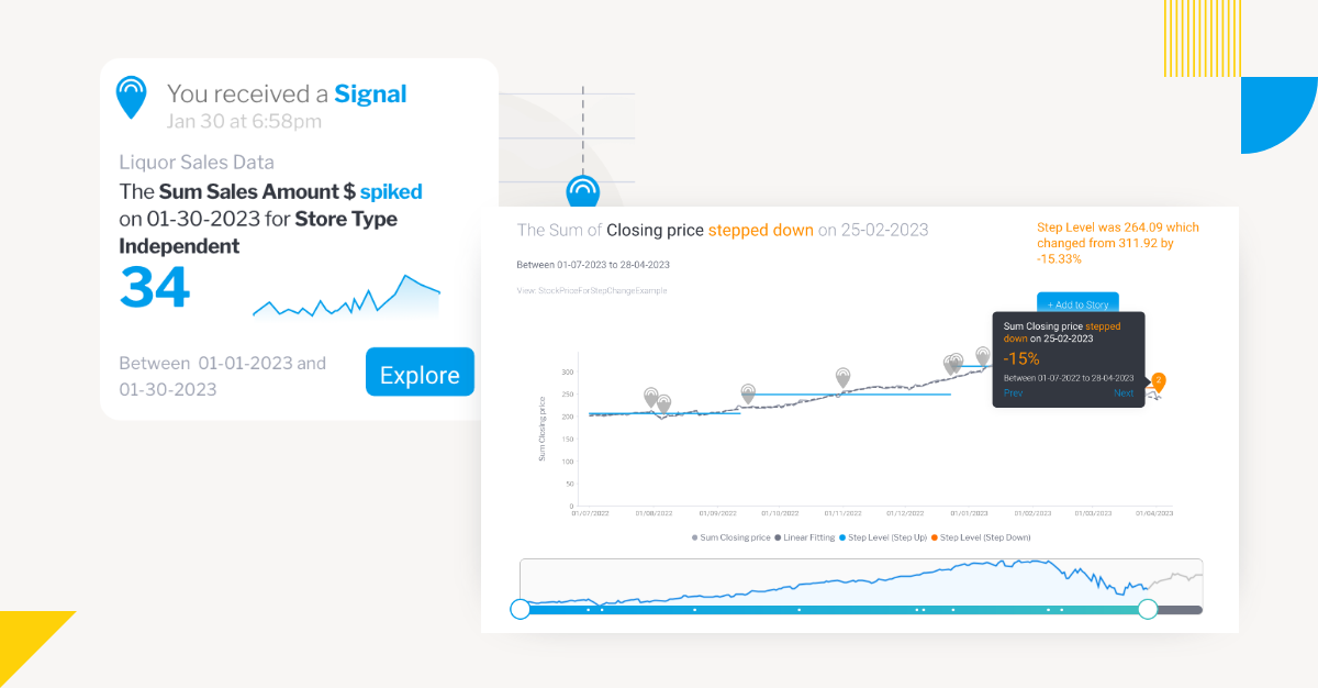 Yellowfin の組み込み分析プラットフォームには、シグナルによる自動インサイト機能が搭載されています。一般的な BI プラットフォームのしきい値アラートベースのツールとは異なり、シグナルはデータのあらゆるスライスを継続的かつ自動的に監視し、外れ値、急上昇や急落、トレンドの変化などの統計的に有意な変化を検出します。これにより、重要な異常を見逃さず、迅速に対応できます。