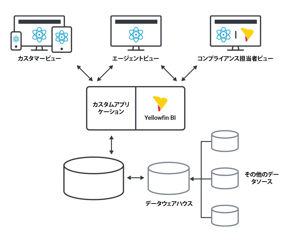 Yellowfinのような組み込みアナリティクスソリューションは、標準的なワークフロー (通常は社内のビジネスアプリケーションやポータル、またはツール) 内にデータアナリティクスやデータビジュアライゼーション機能を統合します。そのため、ユーザーは日常的に業務で使用しているアプリケーション内で貴重なインサイトを得ることができ、アプリケーションを切り替えたり、別のアナリティクスアプリケーション (一般的なBIツールなど) にデータを移行する必要がありません。