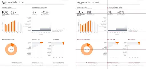 位置合わせを使用することで、階層化を行うことができます。人間の目は左上から右下に向かう傾向があるため、グラフのヘッダーやグラフ、テキストのブロックをそれに合わせて視覚的に配置することを考えます。