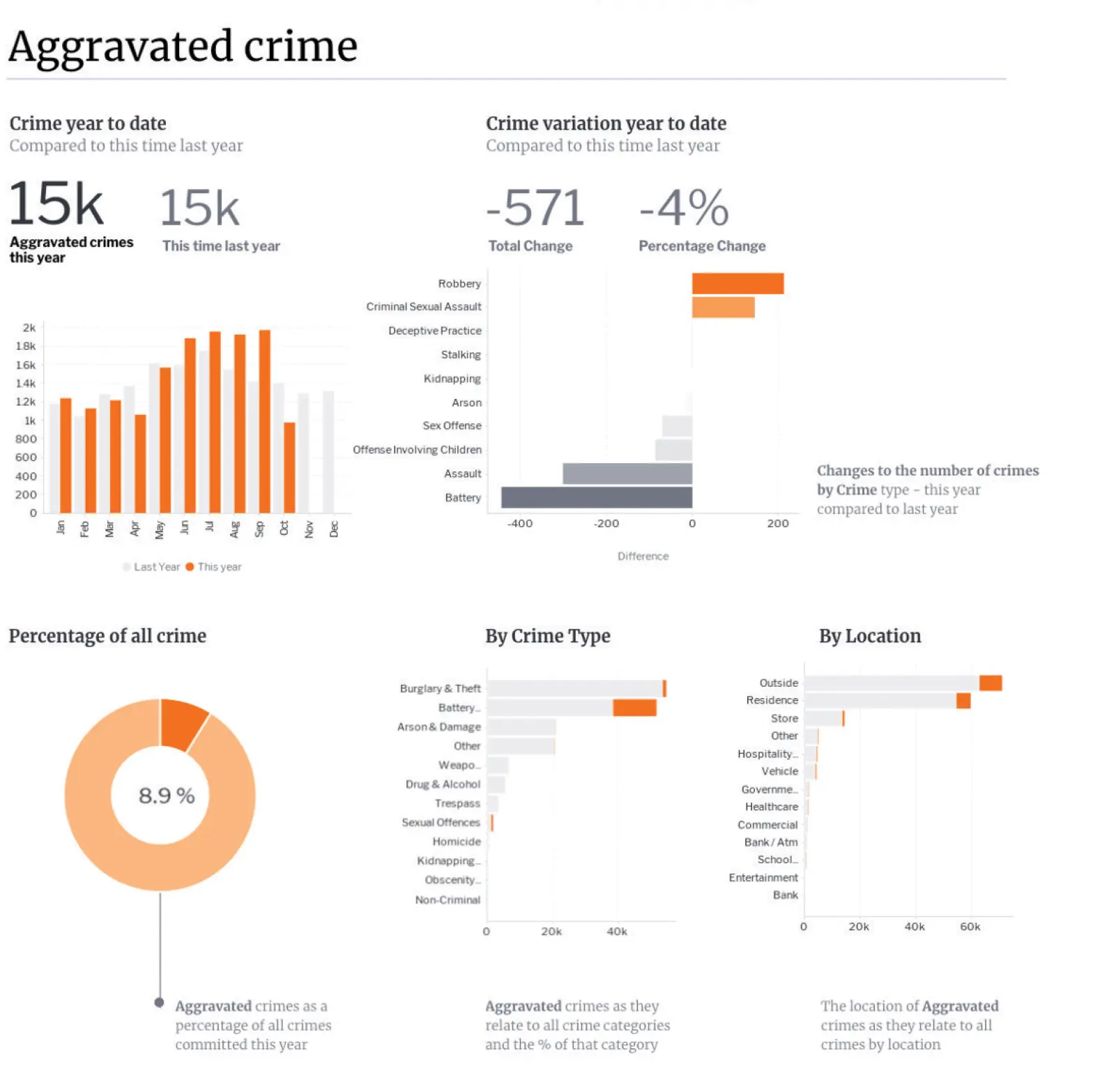 ダッシュボードやそのデータビジュアライゼーション、図表に付随するテキストは、読みやすく、ダッシュボードの閲覧者をガイドするのに有効でなくてはいけません。様々なタイプのダッシュボード閲覧者が最大限のアクセシビリティを得られるように、フォントの種類、サイズ、スタイルは常に最小限に抑えましょう。