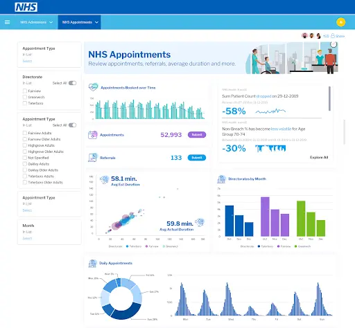 こちらのNHSの例では、管理ダッシュボードをより視覚的にアピールし、より「製品」のように感じさせるために、ヘッダーブロックに絶妙なイメージが追加されています。これにより、非技術系ユーザーによるダッシュボードの採用を高めることができます。これらNHSダッシュボードに関するYellowfinの取り組みについての詳細は、NHS North Tees and Hartlepoolの事例でご確認いただけます。