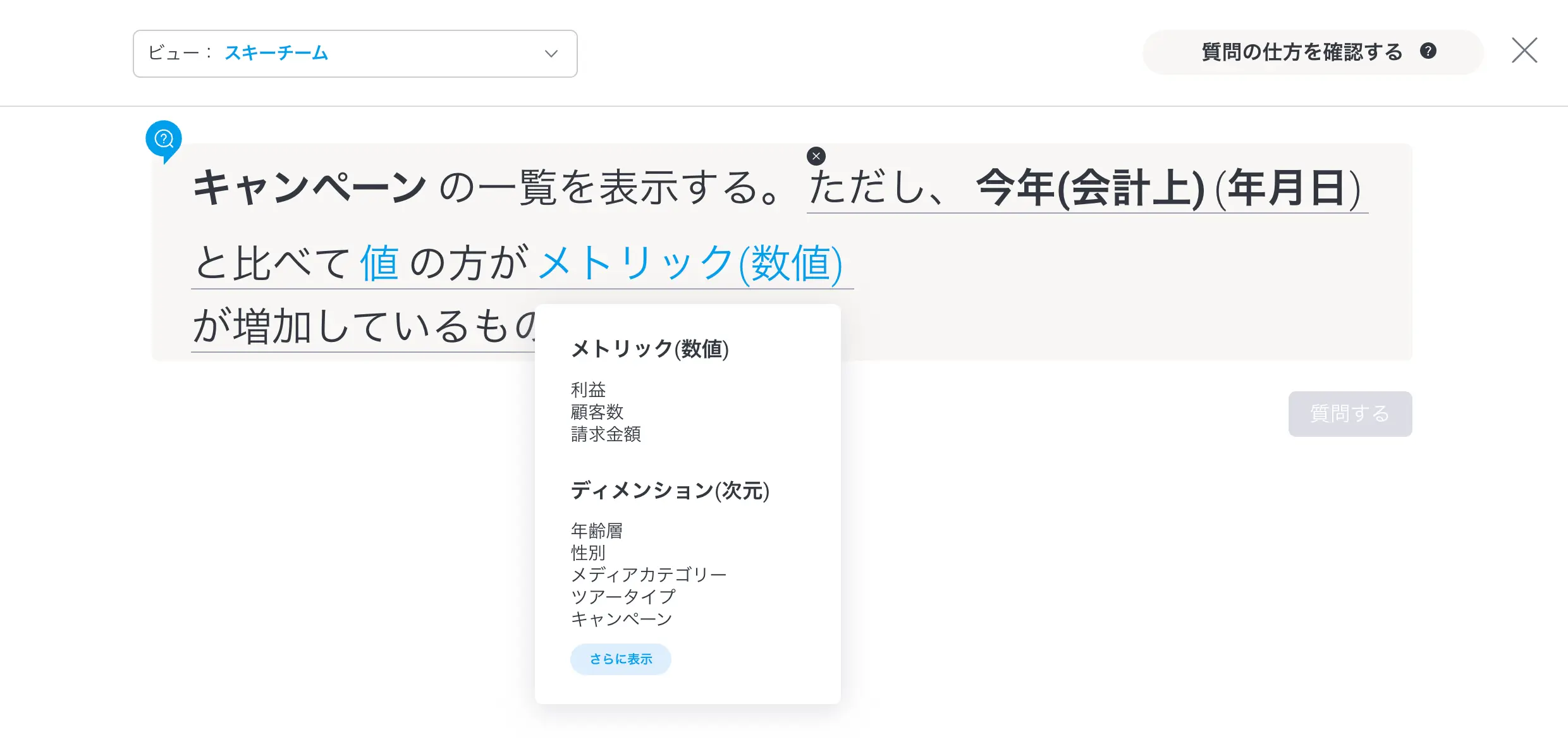 こうした限界を認識したYellowfinでは、ガイド付きNLQ (自然言語クエリ) という少し異なるアプローチを採用しました。これは自然言語処理 (NLP) モデルとは一線を画すものですが、何層にもネストしたクエリを必要とするかなり複雑なユースケースにもうまく対応できる、より実用的なアプローチを提供します。ガイド付きNLQを使用すると、ユーザーは有効なデータ要素を提示され、英語のプロンプトに従ったクエリの生成を支援できます。