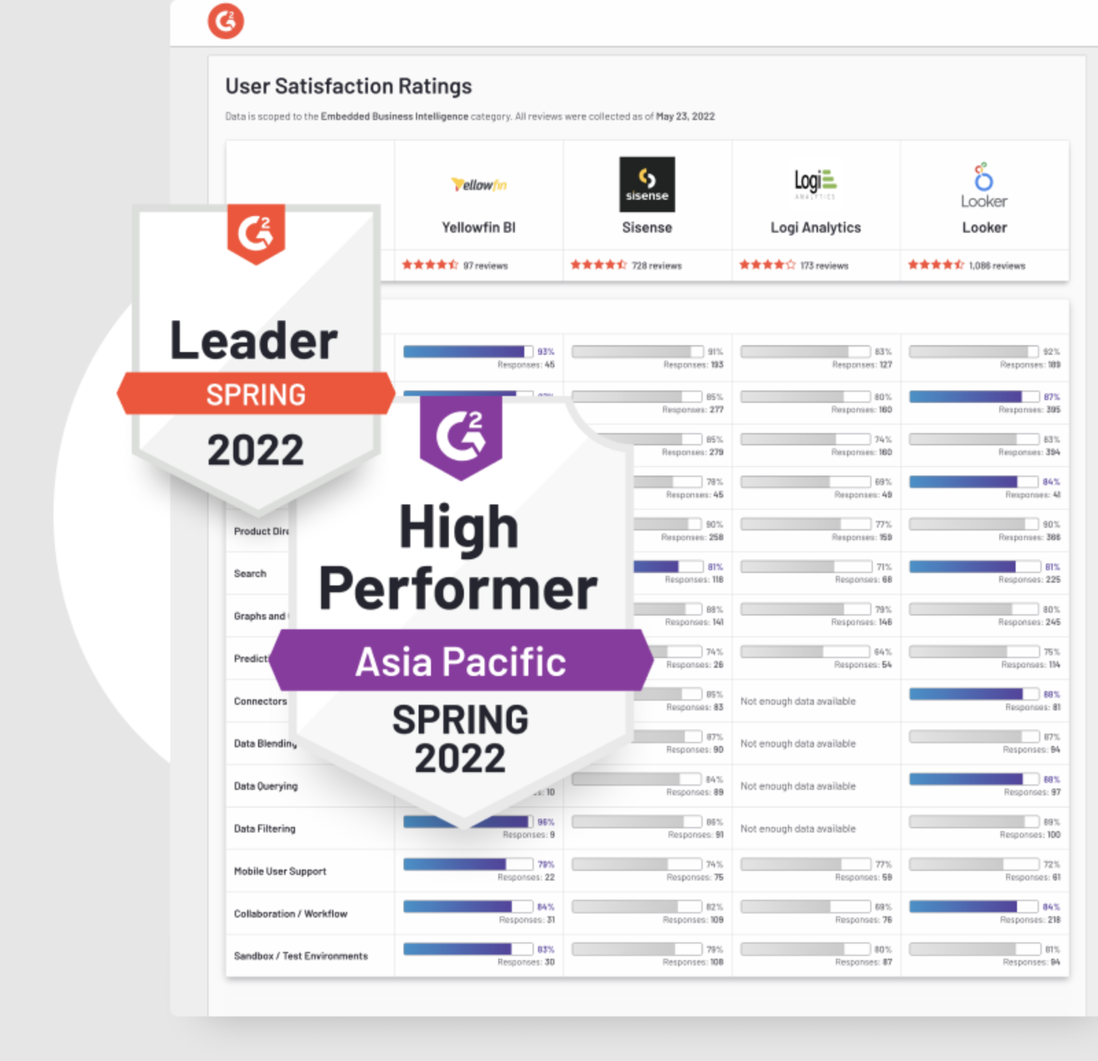 このように、製品、パートナー、データ要件を満たしていることが認められたことは大きな成果です。また、2022年春のG2 アナリティクスプラットフォームと組み込みBIのグリッドレポートにおいて、この分野で最も高い顧客満足度評価を受け、ハイパフォーマーおよびリーダーに再び選出されたことを誇りに思っています。