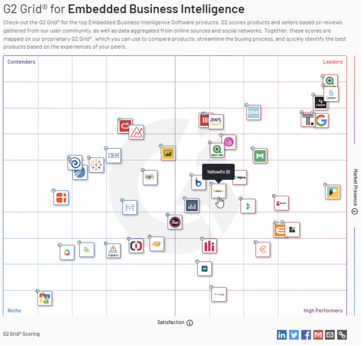 Yellowfinは、(ユーザーレビューに基づく) 顧客満足度と (市場シェア、販売者規模、社会的影響に基づく) 市場プレゼンスによって評価され、リーダー、ハイパフォーマー、コンテンダー (競争者)、ニッチ製品の4つのカテゴリーのいずれかに分類されています。