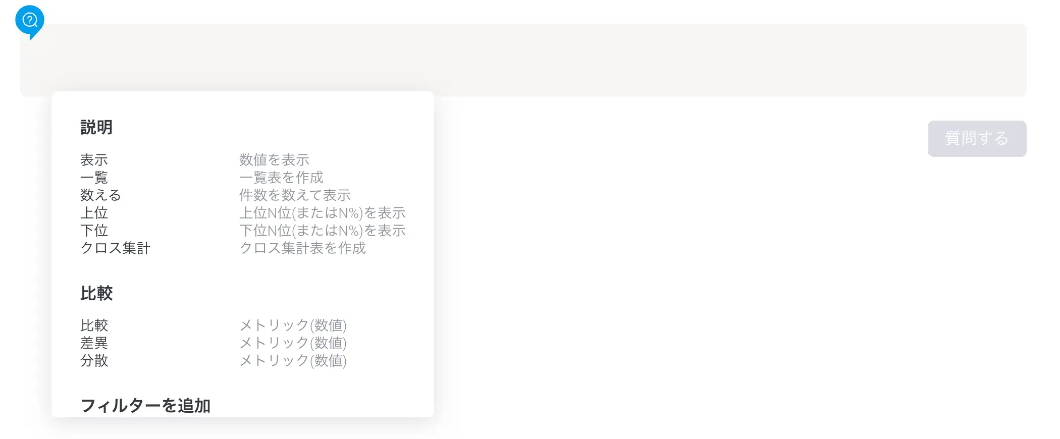 ガイド付きNLQが他のツールと異なる点は、クエリー実行プロセスが完全にガイドされていることです。システムは、事前に特定のデータクエリーを実行する方法を学習したり、習得したりすることなく、ユーザーがデータに質問する方法を正確に説明することで、従来のデータNLQツールで必要とされる複雑さや技術的専門用語を排除するように設計されています。これは、ユーザーが質問を入力する際に、詳細でガイド付きの提案や推奨を (自動化によって) 動的に提供することで実現されるため、ユーザーはリアルタイムでクエリの改良や変更を行い、必要な回答を簡単に見つけることができます。ガイド付きNLQでは、基本的な質問タイプがシステムにあらかじめ設定されているので、初心者は提案を活用して複雑な質問の作成方法を素早く学ぶことができます。