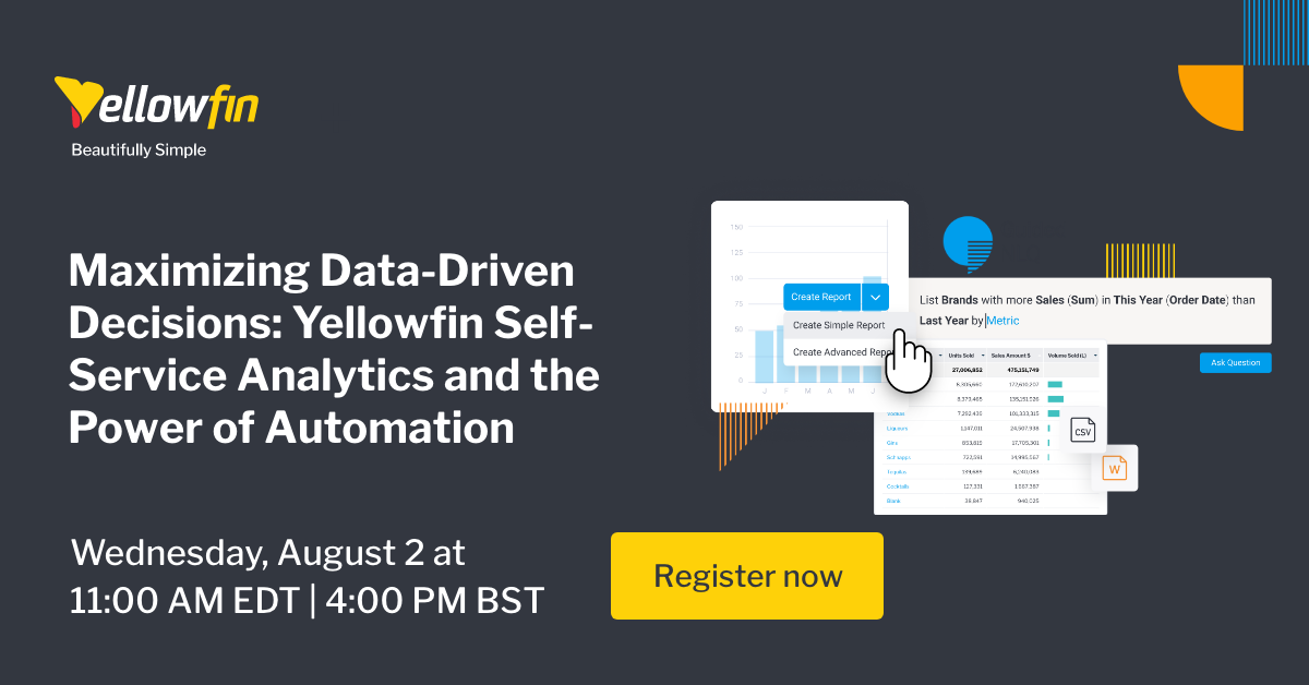 ビジネスユーザーと経験豊富なデータアナリストの両方に最適なこちらのウェビナーは、Yellowfinのセルフサービスアナリティクスの可能性を最大限に活用するための貴重なインサイトの提供を約束します。登録はこちらからお願いします。