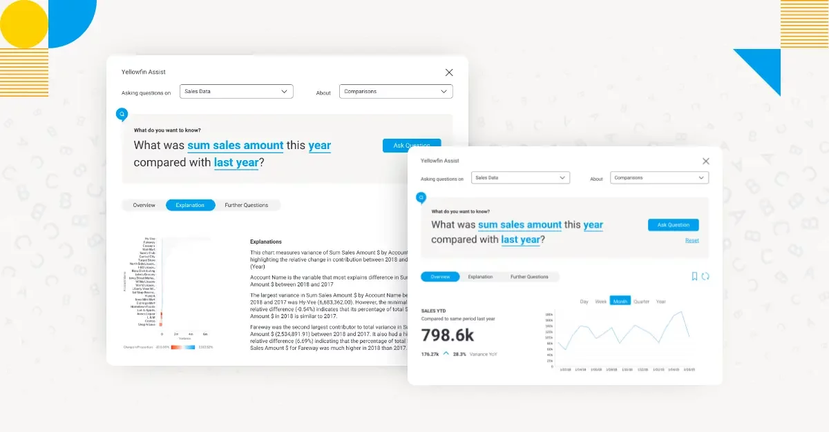 ビジネスインテリジェンスソリューションへのAIの統合は、多くの場合、拡張アナリティクスまたはAIアナリティクスと呼ばれます。レポーティングプロセスでAIを活用することによる変革の力は、組織がデータにアクセスし、分析して、解釈する方法を大きく変革しています。トレンドの発見からインサイトの自動化まで、その可能性は無限です。Yellowfinは、シグナルの自動化、自動インサイトでの機械学習 (ML)、ガイド付きNLQでの自然言語クエリなど、長年にわたり独自機能の多くにAIを統合しており、エンドユーザーは、データディスカバリーや意思決定プロセスを支援するいくつかの利点を享受してきました。