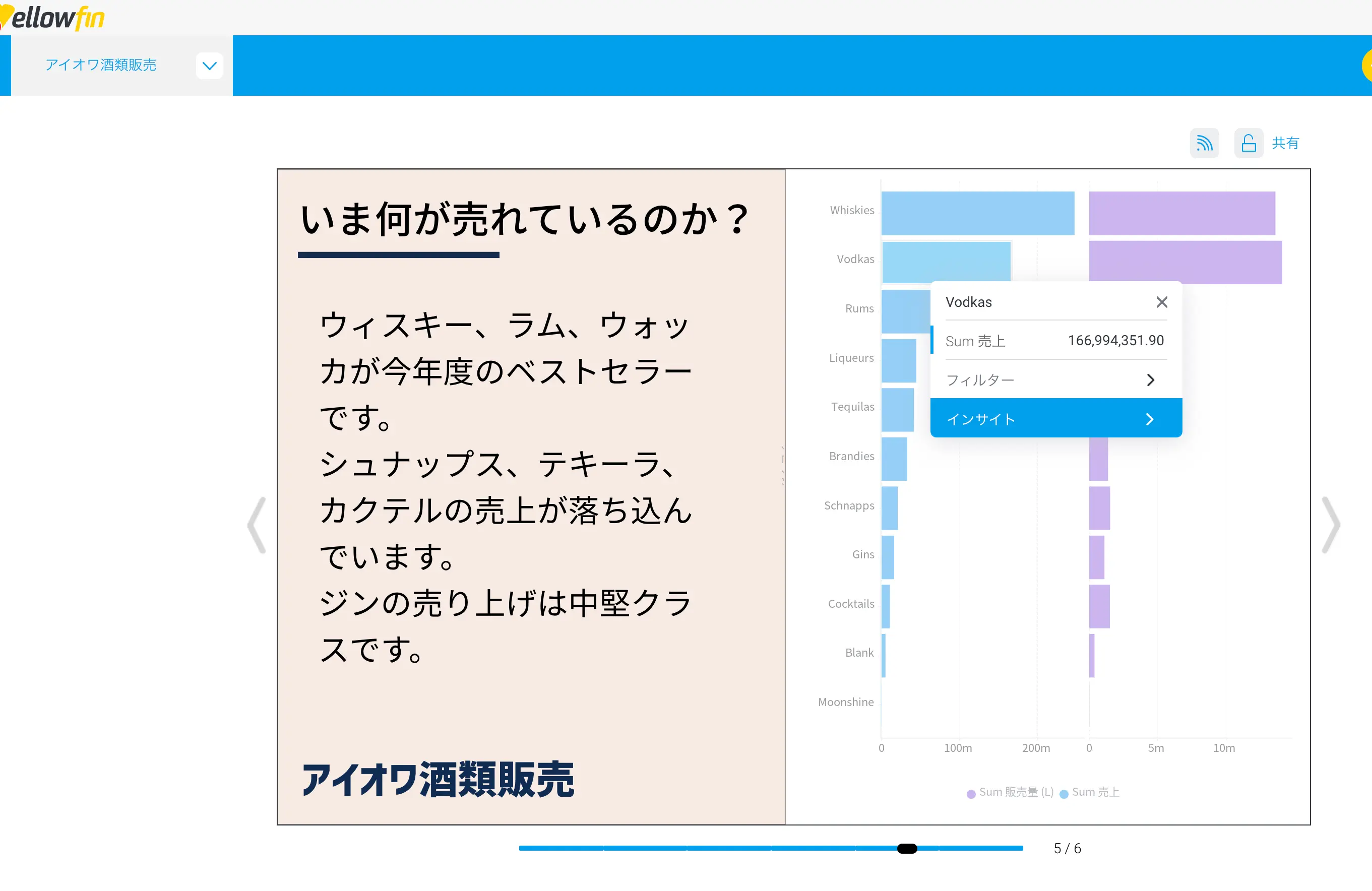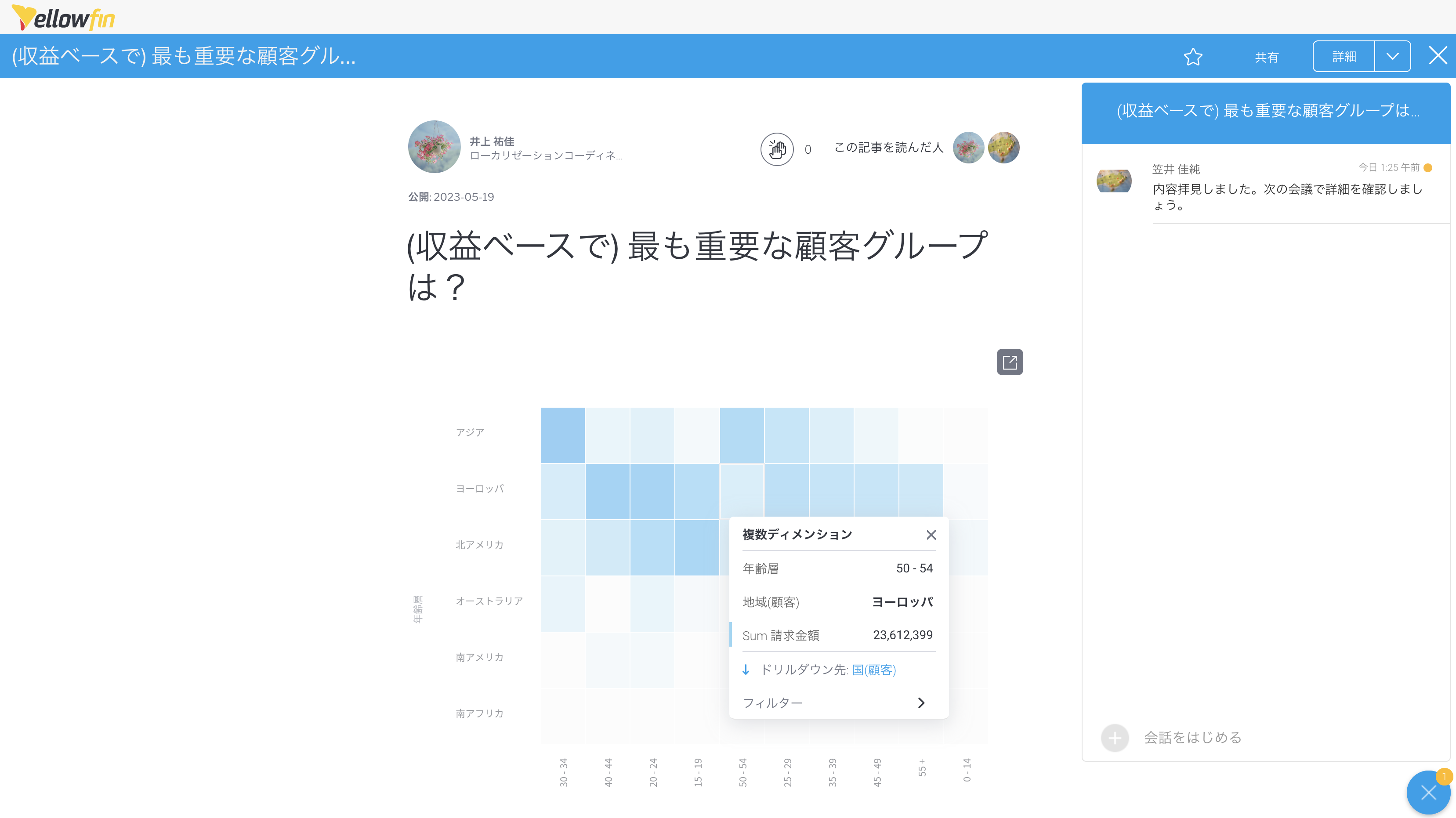Yellowfinのデータストーリーテリング機能であるストーリーやプレゼントのおかげで、これらはYellowfinの「スイートスポット」になっています。ストーリーはデータ中心のブログ、プレゼントはPowerPoiontのスライドに似ていますが、どちらもインタラクティブなレポートやグラフを含めることができます。ストーリーはブログのようなコメント機能を備えており、例えばキャンペーンのアイデアについて議論するために使用することができます。