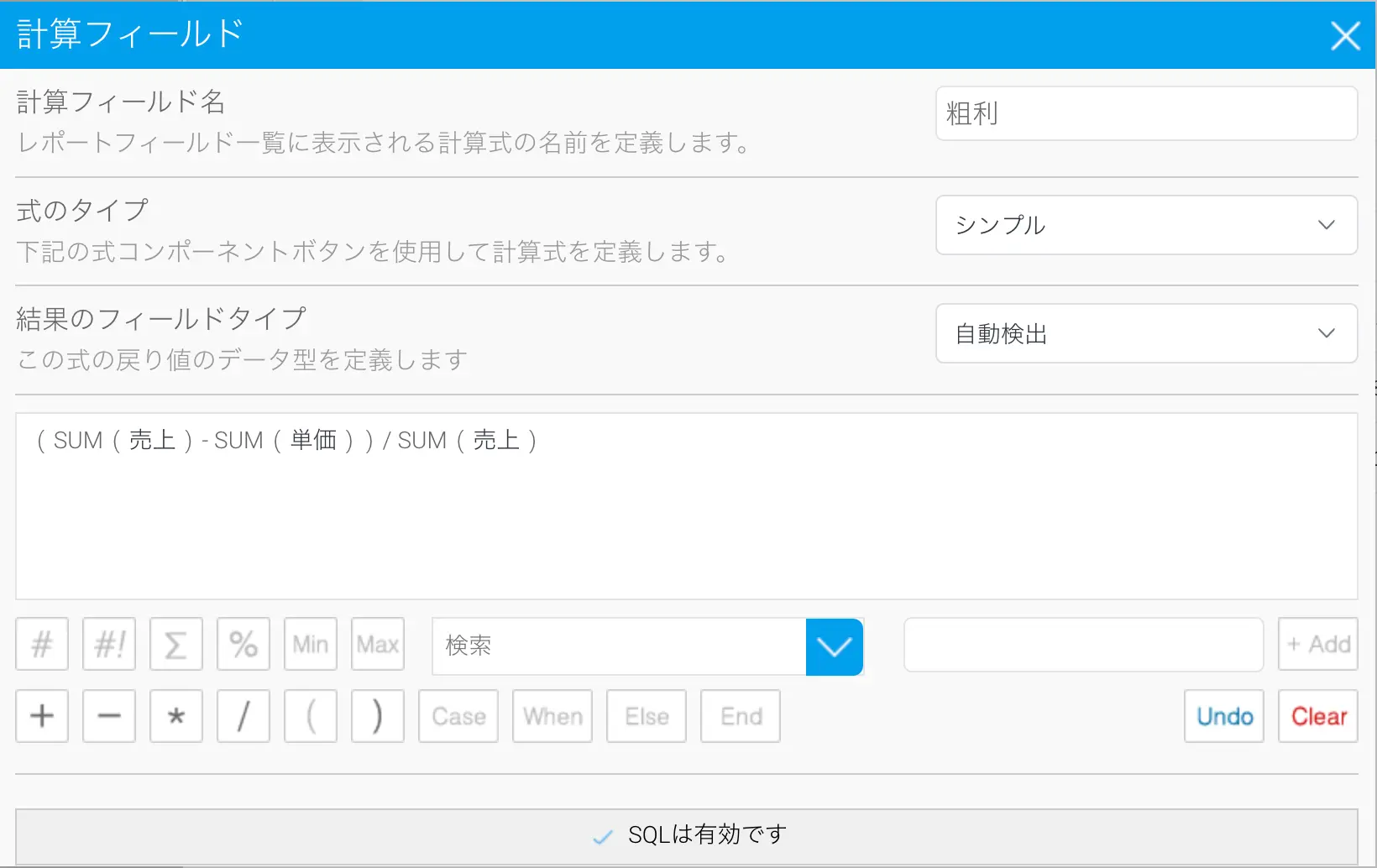 以下の例では、マージンを計算するために集約値を使用した粗利計算フィールドを定義しています。これは、クエリーが平均値を集計して誤った結果を返すため、データベースに保存することができません。