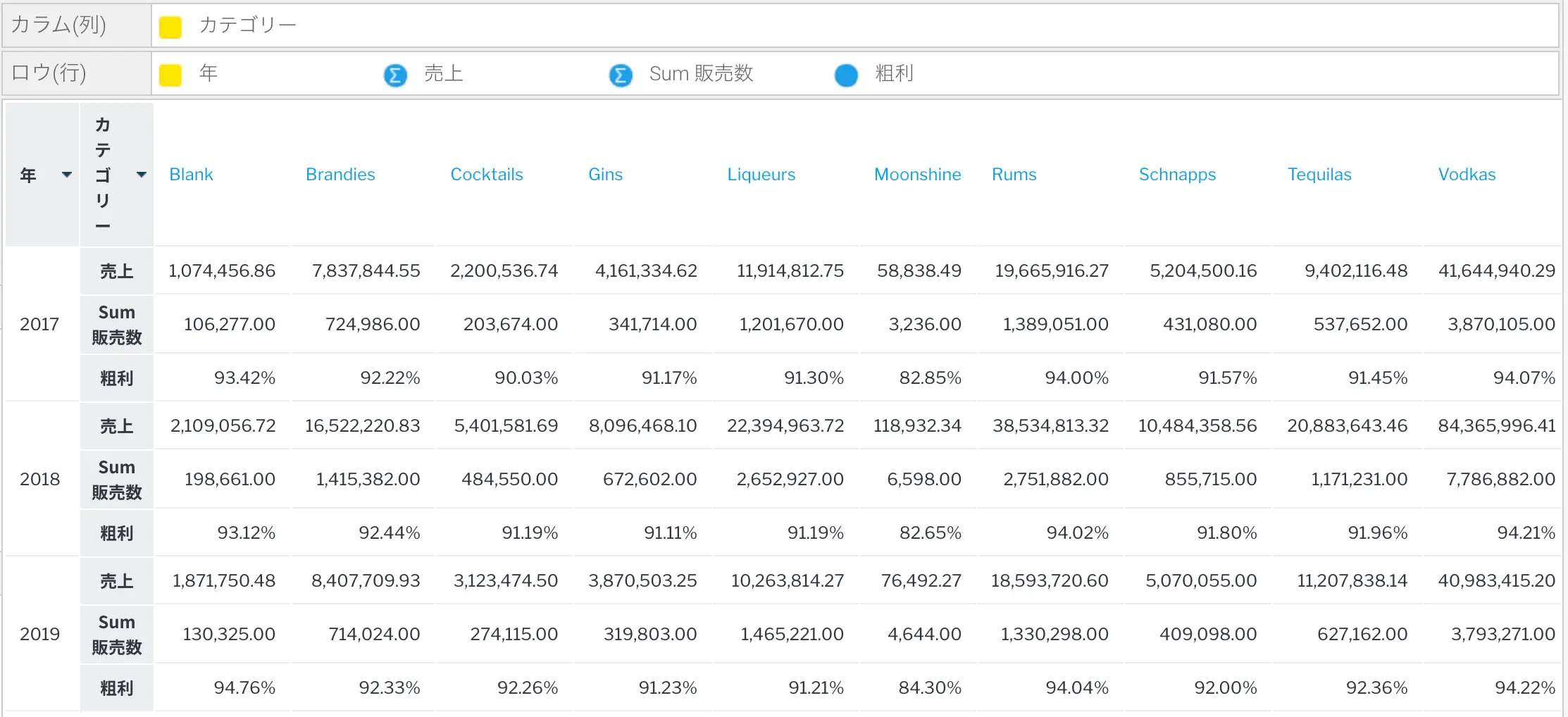 データフィールドは、カラム (列) またはロウ (行) として定義できます。これにより、次のようなクロス集計レポートを作成することができます。カラムおよびロウ項目の両方に複数のディメンション (次元) カラムを追加でき、複数のメトリック (数値) を追加することもできます。